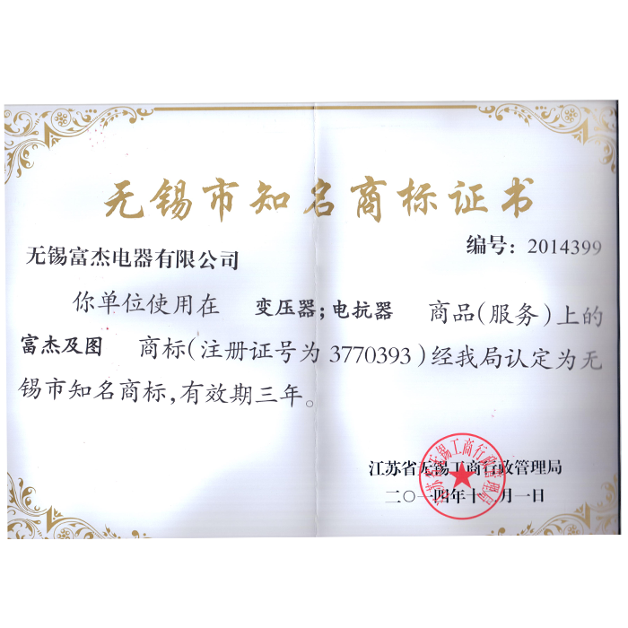 無錫市知名商標證書